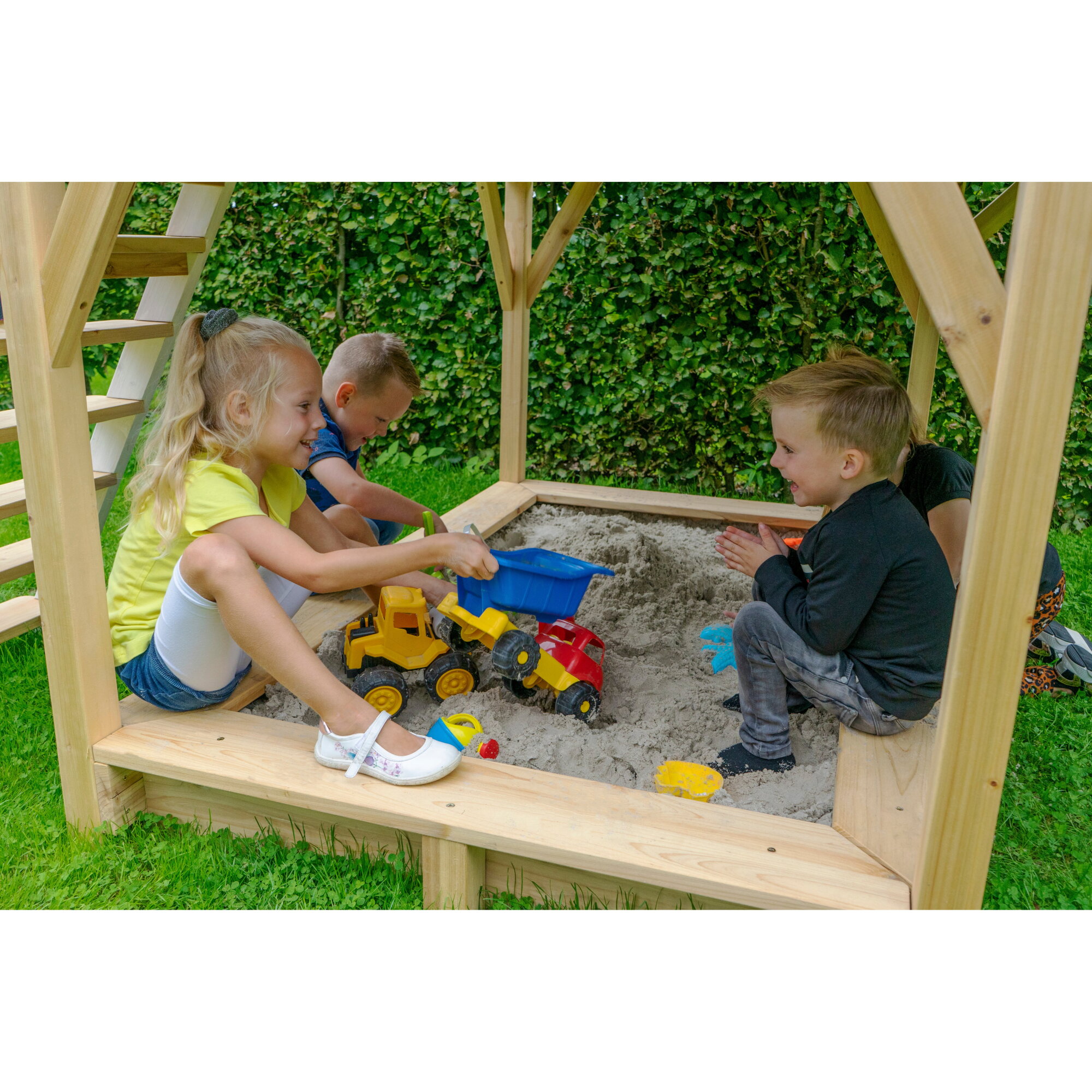 בית המשחק המוגבה כולל לא רק מגלשה כיפית לגלישה, אלא גם ארגז חול מרווח מתחת לבית עצמו. הילדים יכולים לחוות הרפתקאות גם במבנה עצמו וגם לשחק בחול מתחתיו, מה שמעניק להם מגוון של אפשרויות למשחקים בחוץ.