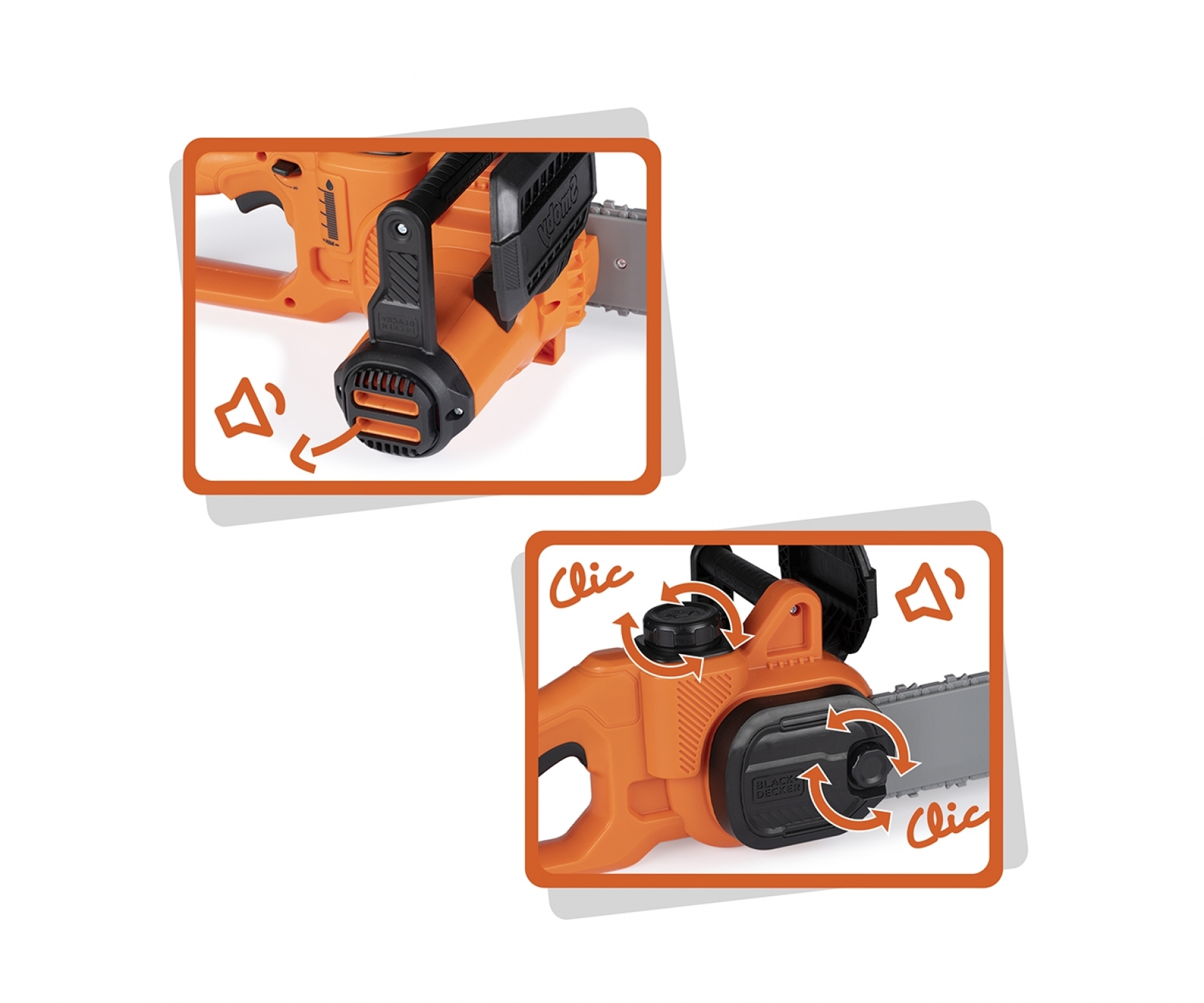 היכנסו לעולם היערות עם מסור השרשרת החדש מבית B+D! המסור עוצב במיוחד לאוהבי DIY ומספק חוויה מציאותית ומרגשת. הלהב של המסור מתנועע בעת השימוש, ומוסיף לחוויית המשחק תחושת ריאליזם. המסור גם מפיק את הצליל האמיתי של מסור יחד עם פלאש קטן של LED כשמשתמשים בו.