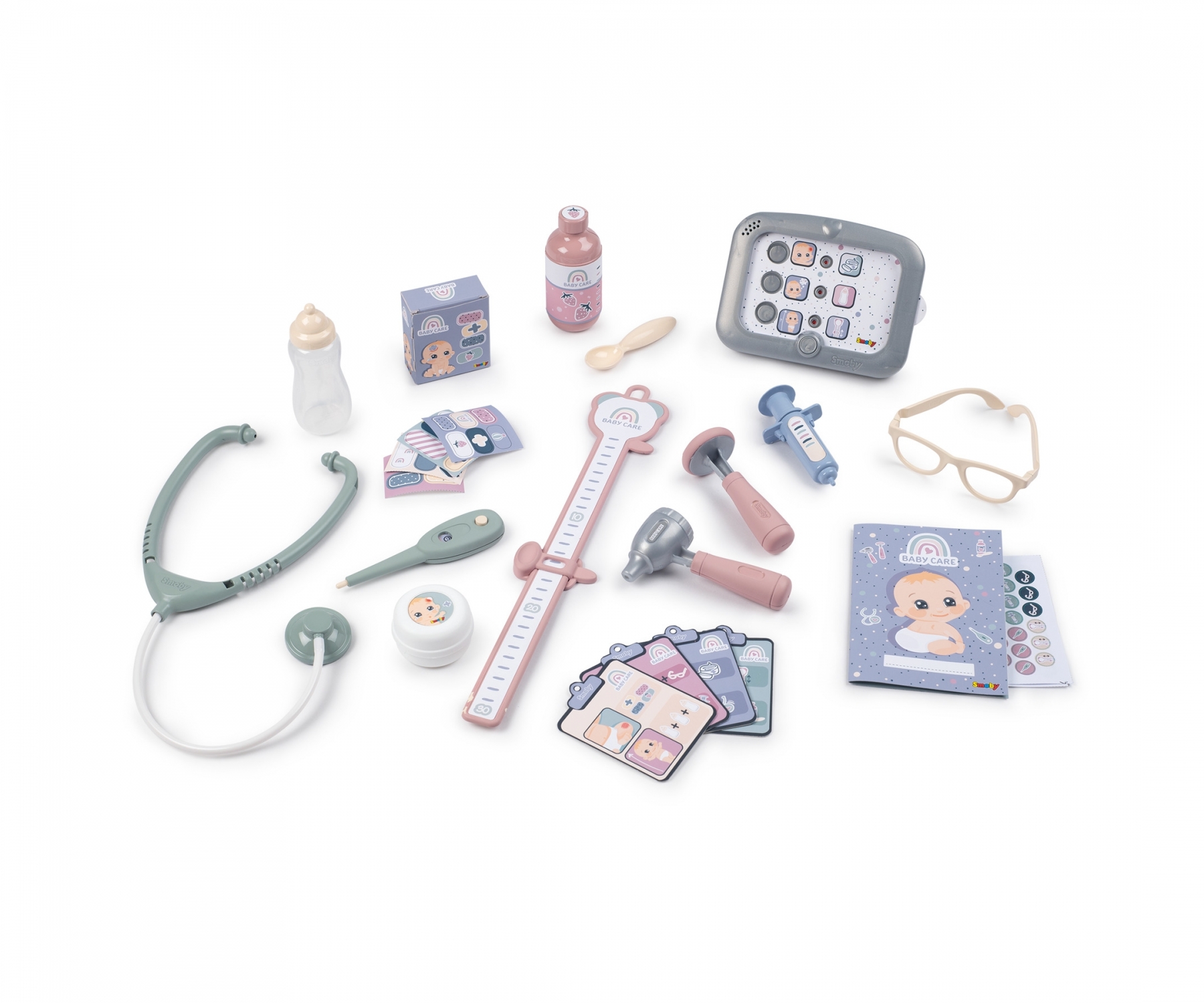 הסט כולל אביזרים רבים: חיתול בובה, מזרק, קופסת פלסטרים, סט אתרי בדיקה, בקבוק תרופה, פטיש רפלקסים, סטטוסקופ ועוד. לאחר המשחק, ניתן לאחסן את כל האביזרים בתאי אחסון המובנים.